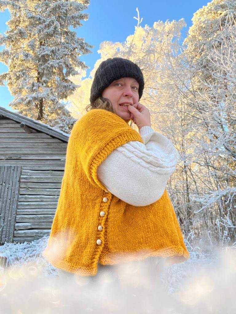 Työohje Poncho neulotaan yhteenä kappaleena + kaulus.